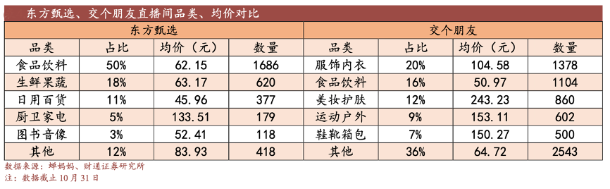 經(jīng)典案例:根據(jù)蟬媽媽、財通證券研究所等綜合資訊表明,對比東方甄選和交個朋友直播間的商品,東方甄選品類集中度較高,以食品飲料為主;交個朋友品類分布相對均勻,以服飾內(nèi)衣為主。同時東方甄選商品數(shù)量相對較少,均價較低且價格區(qū)間較窄;交個朋友直播間商品數(shù)量相對更豐富,偏向全品類覆蓋,均價相對更高,價格區(qū)間更廣。