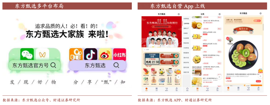 經(jīng)典案例:根據(jù)東方甄選公眾號、東方甄選APP、財通證券研究所等綜合資訊表明,東方甄選在抖音平臺外,前瞻布局微信公眾號及視頻號,在快手、微博、小紅書也建立了官方賬號,淘寶平臺開設(shè)官方旗艦店;目前東方甄選獨立 App 也已上線,購物 App 中既包含自營品類,也包含第三方商家產(chǎn)品。