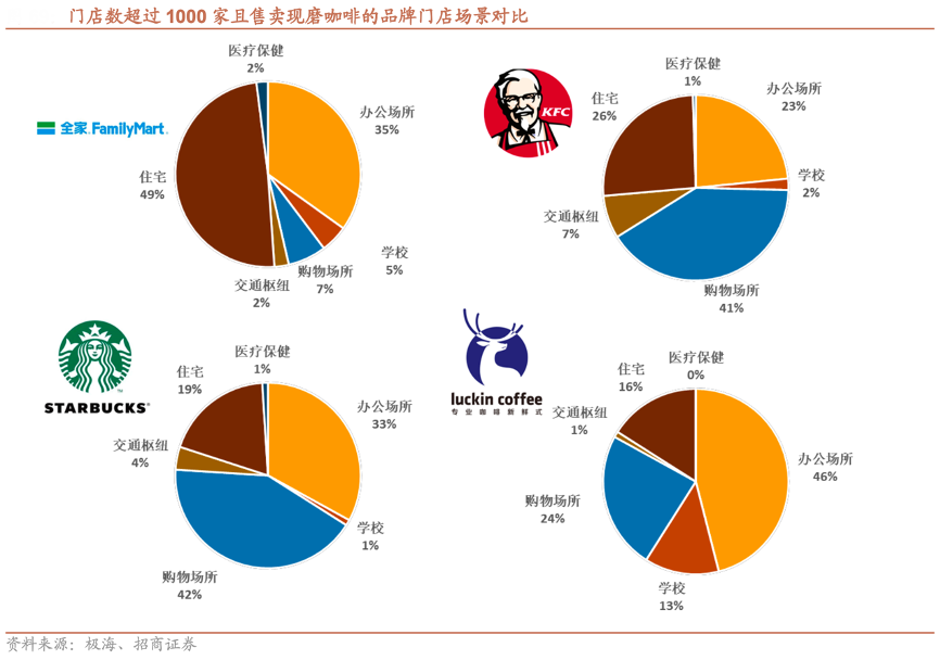 經(jīng)典案例:根據(jù)極海、招商證券等綜合資訊表明,對(duì)比其他門店數(shù)超過 1000 家且售賣現(xiàn)磨咖啡的場(chǎng)景,K咖啡面向購(gòu)物佐餐,全家、7-11等面向社區(qū)。瑞幸的客群更加年輕化,主打?qū)W生及白領(lǐng),對(duì)“快咖啡”場(chǎng)景需求較高,同時(shí)需要專業(yè)的咖啡店來滿足對(duì)高品質(zhì)的要求。而星巴克面對(duì)高端白領(lǐng),提供社交空間;全家、肯德基等切分其他需求。