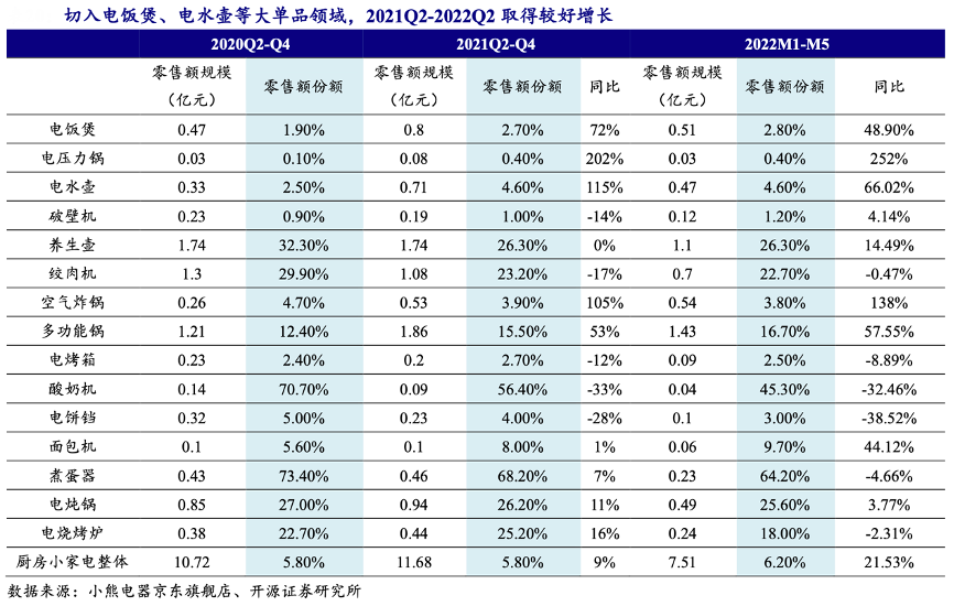 經(jīng)典案例:根據(jù)小熊電器京東旗艦店、開(kāi)源證券研究所等綜合資訊表明,隨著小熊電器發(fā)力電飯煲、空氣炸鍋、電水壺等大單品領(lǐng)域,或推升小熊電器整體成長(zhǎng)空間,擺脫長(zhǎng)尾品類(lèi)帶來(lái)的成長(zhǎng)限制。2021Q2-Q4 小熊電器電飯煲、電水壺、空氣炸鍋京東渠道零售額同比分別+72%、+115%、+105%。2022M1-M5 電飯煲、電水壺、空氣炸鍋京東渠道零售額同比分別+48.9%、66.02%、138%。
