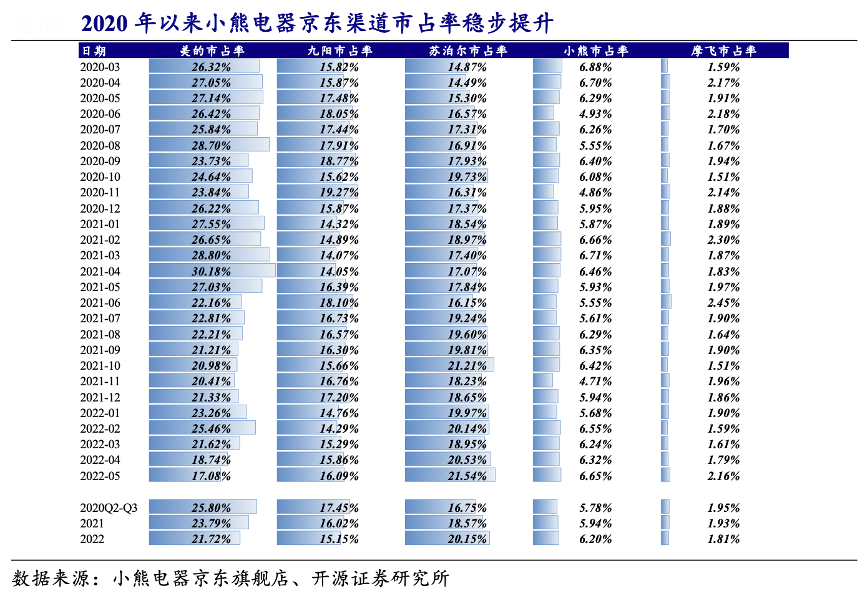 經(jīng)典案例:根據(jù)小熊電器京東旗艦店、開(kāi)源證券研究所等綜合資訊表明,早期小熊電器線上渠道主要分為經(jīng)銷(xiāo)、電商平臺(tái)入倉(cāng)和直銷(xiāo)三種模式,經(jīng)銷(xiāo)模式為主,2020 年天貓渠道體系調(diào)整釋放渠道效率,帶動(dòng)份額穩(wěn)步提升。其中經(jīng)銷(xiāo)模 式 2018 年占比 49%,直銷(xiāo)模式占比 9%左右,電商平臺(tái)入倉(cāng)占比 32%。魔鏡 數(shù)據(jù)顯示,2020年小熊電器渠道體系調(diào)整以來(lái),京東和阿里渠道市場(chǎng)份額穩(wěn)步提升。
