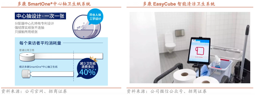 經(jīng)典案例:根據(jù)公司官網(wǎng)、公司微信公眾號、招商證券等綜合資訊表明,維達多康推出的 SmartOne®中 心抽衛(wèi)生紙分配器一次僅可抽取一張,人均耗用量減少 40%,例如對新公共洗手間的打造,以 SmartOne®中心軸衛(wèi)生紙系統(tǒng)、V1 馬桶廁板墊紙系統(tǒng)、S4 泡沫洗手液系統(tǒng)、H1 卷裝擦手紙系統(tǒng)組合為解決方案,減少浪費的同時提高衛(wèi)生管理效率,體現(xiàn)出人文關懷和追求可持續(xù)發(fā)展理念的社會責任感。