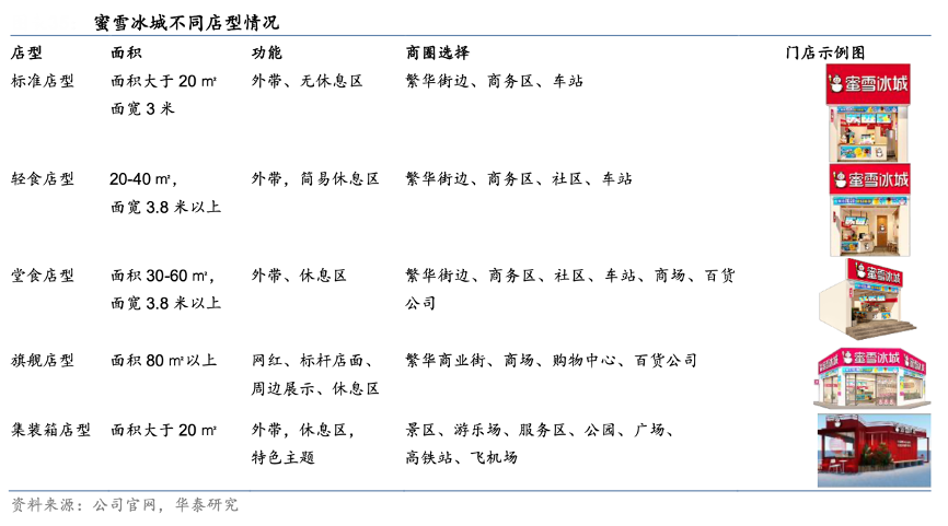 經典案例:根據公司官網、華泰研究等綜合資訊表明,蜜雪冰城公司在標準化小店基礎之上,根據不同場景延伸出輕食、堂食、旗艦、集裝箱等多種門店店型,但皆為100 m²以下的小店。加盟商可根據具體場地情況進行調整,滿足多樣化場景選址要求。