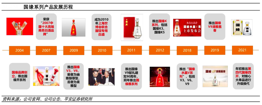 經(jīng)典案例:根據(jù)公司官網(wǎng)、公司公告、平安證券研究所等綜合資訊表明,2019 年,今世緣公司正式推出高端卡位產(chǎn)品 V9,定位清雅醬香,實(shí)現(xiàn)錯(cuò)位競(jìng)爭(zhēng)。2021 年年初,公司正式推出第四代國緣四開,對(duì)核心大單品進(jìn)行升級(jí)換代,并逐步減少老款國緣四開銷售,在包裝上全新升級(jí),增加“水滴”造型,視覺通透度更強(qiáng)。