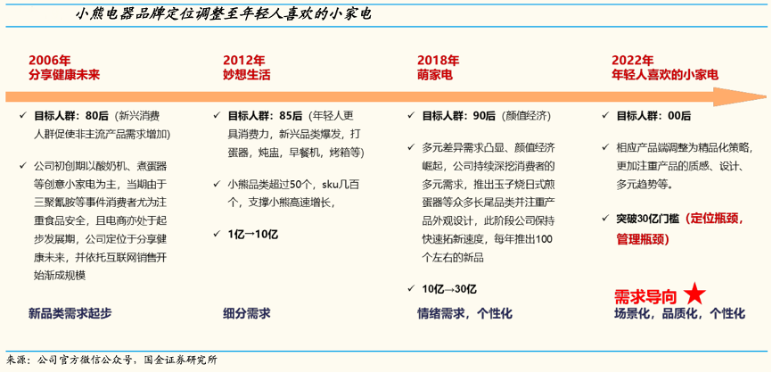 經(jīng)典案例:根據(jù)公司官方微信公眾號、國金證券研究所等綜合資訊表明,小熊電器積極順應(yīng)市場變化,四次品牌定位躍升。面對多變的市場環(huán)境,其積極求變,順應(yīng)市場趨勢,具備快速捕捉市場且自適調(diào)整的能力,契合第三消費時代對企業(yè)的要求。