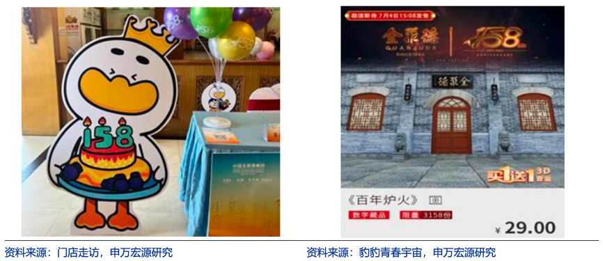 經(jīng)典案例:根據(jù)門店走訪、豹豹青春宇宙、申萬宏源研究等綜合資訊表明,全聚德于 157 周年活動上推 出全新IP 形象“萌寶鴨”,受到年輕消費者喜愛。公司進一步豐富“萌寶鴨”IP 內(nèi)容,延 伸打造品牌文化傳播新項目“萌寶星廚直播間”,通過動漫短視頻的形式,講述美食美味的秘密。同時全聚德于今年周年慶上啟動“數(shù)字藏品”發(fā)售儀式,藏品包括 1 款“百年爐火” 視頻和 6 款萌寶鴨造型盲盒。
