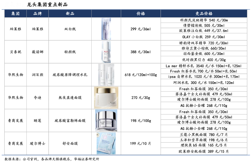 經(jīng)典案例:根據(jù)公司官網(wǎng)、各品牌天貓旗艦店、華福證券研究所等綜合資訊表明,在成功打造大單品的基礎(chǔ)上,頭部化妝品集團推出新品強調(diào)功效拓展,圍繞美白、抗衰、屏障修護等功能持續(xù)發(fā)力?;瘖y品國貨崛起的核心是產(chǎn)品力迎頭趕上,龍頭國貨價格已有支撐,品牌心智建立后價位與國際品牌看齊,從新品價格帶來看,珀萊雅雙白瓶單價接近 OLAY 小白瓶,夸迪熬夜盈透面膜單價接近菲洛嘉十全大補面膜。