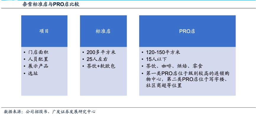 經(jīng)典案例:根據(jù)公司招股書、廣發(fā)證券發(fā)展研究中心等綜合資訊表明,奈雪公司自2020年11月推出奈雪 的茶PRO店。相較于奈雪的茶標準店,奈雪PRO店移除了現(xiàn)場面包房區(qū)域,門店面積更小,人員配置更少,租金及人工成本更低。其產(chǎn)品類別更加多樣,且在選址上更加靈活,不僅可以布局于連鎖購物中心,還能進駐寫字樓、社區(qū)等標 準店較難進入的區(qū)域。