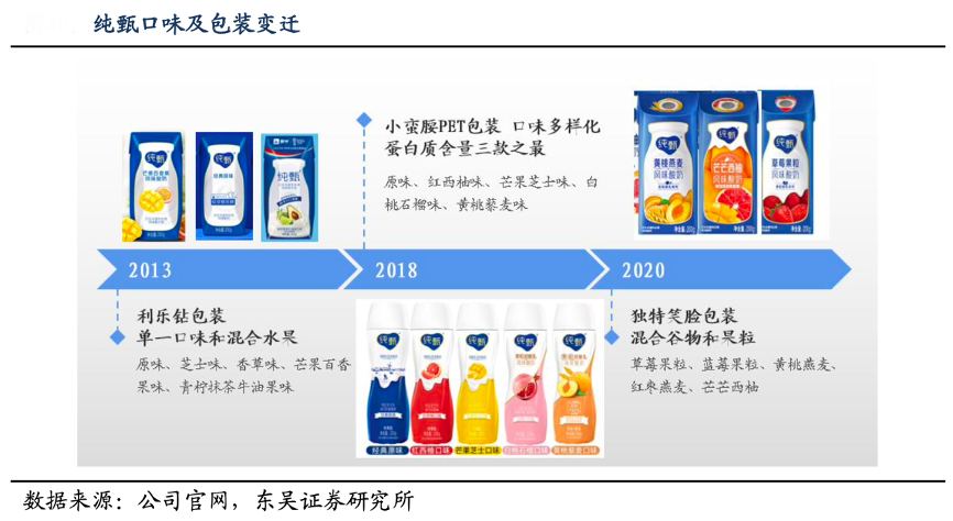 經(jīng)典案例:根據(jù)公司官網(wǎng)、東吳證券研究所等綜合資訊表明,常溫酸奶的升級發(fā)展伴隨口味及包裝的創(chuàng)新與變遷。常溫酸奶的口味從單一向混合谷物、水果發(fā)展,包裝從利樂鉆向利樂冠、PET 瓶變遷,擴展了多種 SKU,產(chǎn)品持續(xù)升 級和創(chuàng)新,強化休閑屬性,便利性和個性化突出。