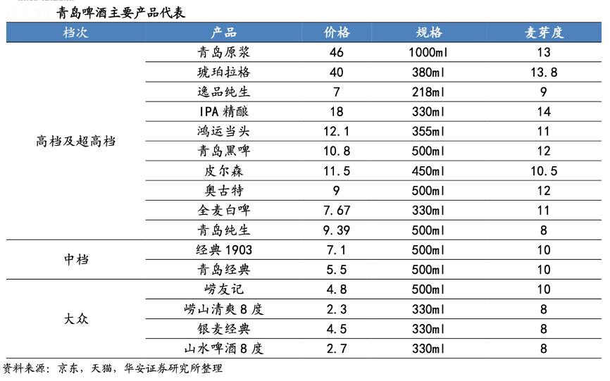 經(jīng)典案例:根據(jù)公司網(wǎng)站、公司公告、淘寶網(wǎng)、公開(kāi)訊息、山證國(guó)際研究部等綜合資訊表明,以青島啤酒為例,公司近年相繼推出百年之旅、原漿啤酒、印度淡色艾爾精釀(IPA)、琥珀拉格、鴻運(yùn)當(dāng)頭和奧古特等一系列具有鮮明特色、符合市場(chǎng)需求的高端啤酒新產(chǎn)品,進(jìn)一步豐富高端產(chǎn)品組合,加強(qiáng)在國(guó)內(nèi)啤酒中高端市場(chǎng)的競(jìng)爭(zhēng)優(yōu)勢(shì)。
