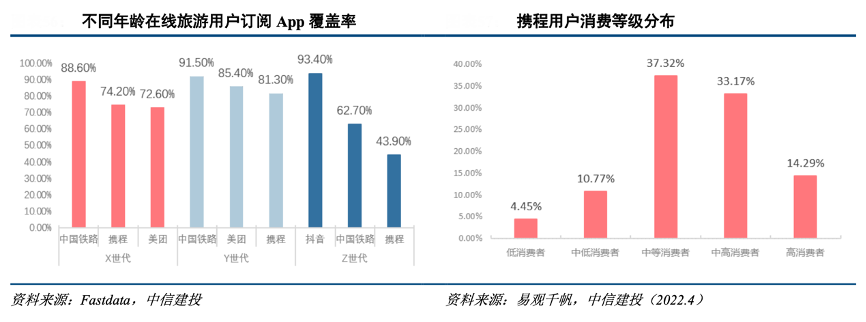 經(jīng)典案例:根據(jù)Fastdata、易觀千帆、中信建投等綜合資訊表明,攜程發(fā)布的《中國高端旅游出行趨勢(shì)洞察》,31-50 歲用戶是旅行消費(fèi)的主力軍,攜程用戶中 31-50 歲用戶的占比接近70%;與此同時(shí),攜程在年輕一代的安裝率也呈逐年上升趨勢(shì),根據(jù)易觀千帆,2022 年 4 月攜程用戶中中等以上消費(fèi)者占比達(dá)到85 %。