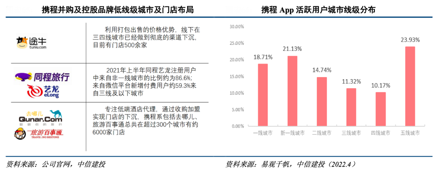 經(jīng)典案例:根據(jù)公司官網(wǎng)、易觀千帆、中信建投等綜合資訊表明,美團(tuán)酒旅的快速崛起某種程度上得益于其在下沉市場(chǎng)的布局,近年來,為應(yīng)對(duì)美團(tuán)等新興巨頭的競(jìng)爭(zhēng),攜程也積極深入下沉市場(chǎng),其主要打法分為兩個(gè)方向,一是通過去哪兒等合作平臺(tái)拓展低線城市低星酒店市場(chǎng),另一方面是聯(lián)手去哪兒、百事通等平臺(tái)以加盟模式大力布局低線城市線下門店,提高下沉市場(chǎng)滲透率。