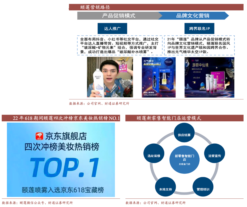 經(jīng)典案例:根據(jù)頤蓮微信公眾號、公司官網(wǎng)和財通證券研究所等綜合資訊表明,頤蓮品牌打通全渠道鏈路,線上聯(lián)合超頭多點種草。具體來看:1)線上,頤蓮目前仍以線上銷售為主,21 年線上收入占比達(dá) 96.17%。除傳統(tǒng)電商渠道之外,重點布局 抖音、快手、小紅書等平臺,持續(xù)推廣其大單品頤蓮噴霧,實現(xiàn)品牌的引流與留 存效果;2)線下重視新興業(yè)態(tài)渠道:21 年頤蓮線下收入占比 3.83%,一方面聚焦年輕人群集結(jié)地,布局全國性美妝集合店及潮品店,如三福百貨、KK 及調(diào)色師、 OLE 精品超市,盒馬鮮生等新興 CS 渠道等。