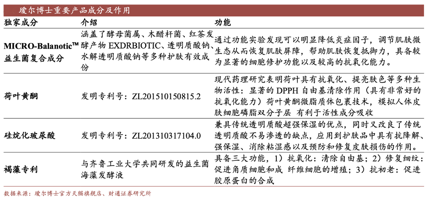 經(jīng)典案例:根據(jù)璦爾博士官方天貓旗艦店、財通證券研究所等綜合資訊表明,通過在產(chǎn)品研發(fā)領(lǐng)域的持續(xù)深耕,璦爾博士推出了多項獨家產(chǎn)品成分并以此持續(xù)豐富品類矩陣。品類上,目前品牌推出了身體乳、潔面慕斯、水乳品類等,以益生菌原料為主打,另外輔以氨基酸、二裂酵母、藍(lán)銅勝肽、透明質(zhì)酸、煙酰胺等原料來達(dá)到保濕、清潔和提亮效果。
