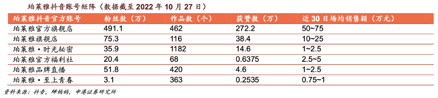 經(jīng)典案例:根據(jù)抖音、蟬媽媽、申港證券研究所等綜合資訊表明,珀萊雅圍繞主賬號(hào)構(gòu)建賬號(hào)矩陣,搶占流量池。珀萊雅抖音有 6 個(gè)官方賬號(hào),以珀萊雅 官方旗艦店為核心賬號(hào),輻射珀萊雅旗艦店、珀萊雅·時(shí)光秘密等 5 個(gè)二級(jí)賬號(hào)。珀萊雅官方旗艦店目前擁有粉絲 491.1 萬(wàn),發(fā)布作品 462 個(gè),獲贊 272.2 萬(wàn),近 30 日?qǐng)鼍N售額達(dá)到 50~75 萬(wàn)元。