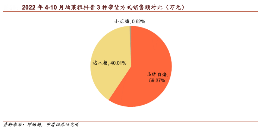 經(jīng)典案例:根據(jù)蟬媽媽、申港證券研究所等綜合資訊表明,珀萊雅注重自播渠道,直達(dá)消費(fèi)者沉淀私域流量。2022 年 4-10 月,珀萊雅品牌自播、 達(dá)人播、小店播帶貨銷售額分別為 2.5~5 億、1 億~2.5 億、250~500 萬(wàn)元,占比 分別為 59.37%、40.01%、0.62%。