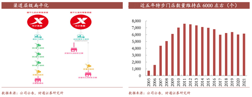 經(jīng)典案例:根據(jù)公司公告、財通證券研究所等綜合資訊表明,行業(yè)庫存危機過后特步公司進入內(nèi)部變革階段,2015年其提出將原有 5 級經(jīng)銷商體系進行扁平化,2017年扁平化改革完成,其中約60%的店鋪由公司的獨家總代理商直接經(jīng)營。
