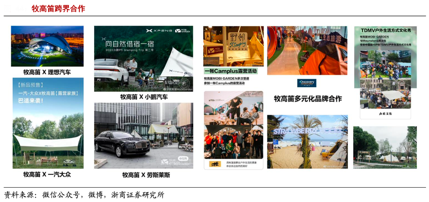 經(jīng)典案例:根據(jù)微信公眾號、微博、浙商證券研究所等綜合資訊表明,牧高笛近年開展的跨界合作主要包括:1)贊助專業(yè)隊伍:贊助北大山鷹社徒步中國南極科考、徒步加拿大洛基山脈等,強化“露營專業(yè)主義”品牌形象;2)汽車品牌合作:與理想、小鵬、勞斯萊斯、奔馳等高端車企合作舉辦露營活動,直接觸達精致露營目標客群,同時加深高端、精致的品牌形象;3)綜藝節(jié)目合作:2022 年 4 月公司與愛奇藝、江蘇衛(wèi)視聯(lián)合出品戶外綜藝《一起露營吧》,為大眾打造潮流有趣的露營白皮書,推廣精致露營概念。