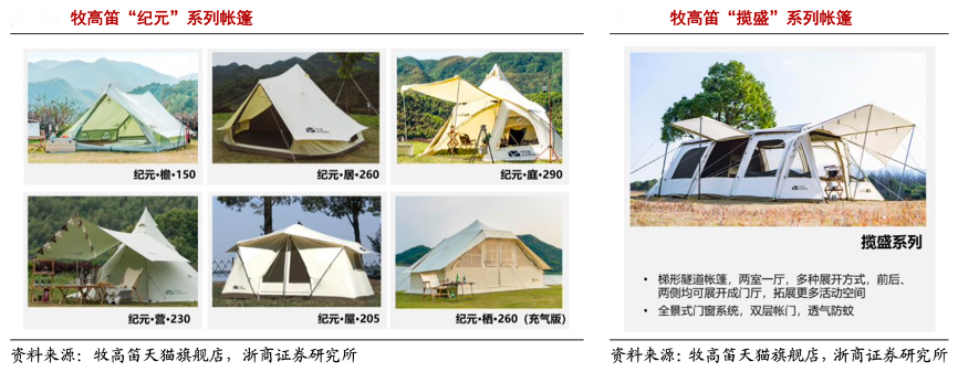 經(jīng)典案例:根據(jù)牧高笛天貓旗艦店、浙商證券研究所等綜合資訊表明,牧高笛公司于 2020 年推出“紀元”系列,定位高端精致露營市場,相比于傳統(tǒng)戶外帳篷,紀元系列帳篷內(nèi)部空間大幅擴大,高度達到 1.8-2.9 米,可以展開前廳,使用者可以在帳篷內(nèi)烹飪,契合精致露營場景的獨特需求。2021年公司推出“攬盛”梯形隧道帳篷,活動空間更大且利用率高,上市后始終占據(jù)銷量前列,多次追加補單,成為公司另一大爆款產(chǎn)品。