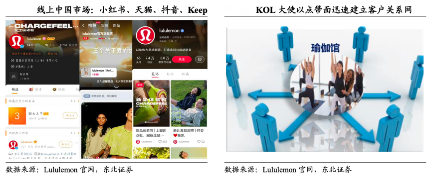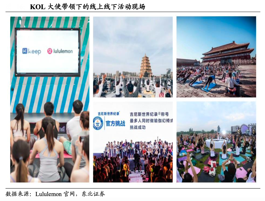 經(jīng)典案例:根據(jù)Lululemon官網(wǎng)、東北證券等綜合資訊表明,Lululemon公司在各大城市公開舉辦瑜伽訓練,瑜伽趣味活動等,同時聘請當?shù)赜新曂?nbsp;KOL 大使,吸引當?shù)氐蔫べ酆谜撸麄髌放评砟?,迅速形成粉絲社群。以進軍中國市場初期為例,Lululemon 定期在北京、上海、深圳、西安等地開展線下集體瑜伽活動,邀請在門店消費的顧客參加活動,請來當?shù)氐倪\動大使以及瑜伽業(yè)內有名望的專業(yè)人士,活動現(xiàn)場異常火爆。