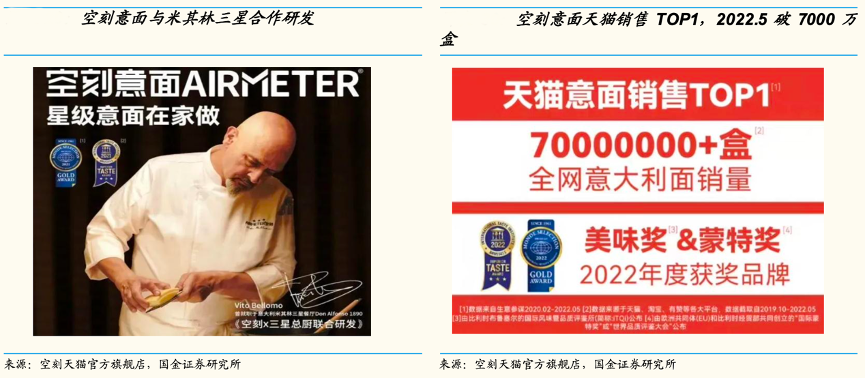 經(jīng)典案例:根據(jù)空刻天貓官方旗艦店、國金證券研究所等綜合資訊表明,空刻意面具備濃厚的互聯(lián)網(wǎng)基因,定位新銳白領(lǐng)、資深中產(chǎn)和精致寶媽,通過廣告瞄定、包裝設(shè)計(jì)、KOL 帶貨等方式直擊消費(fèi)人群。在 KOL 營(yíng)銷方面,2020 年 10 月公司嘗試與頂流主播合作,取得了 1 分鐘 7 萬盒售罄的成績(jī)。據(jù)天貓官方旗艦店數(shù)據(jù)顯示,2019.10-2022.5 空刻銷售額破 7000 萬盒。
