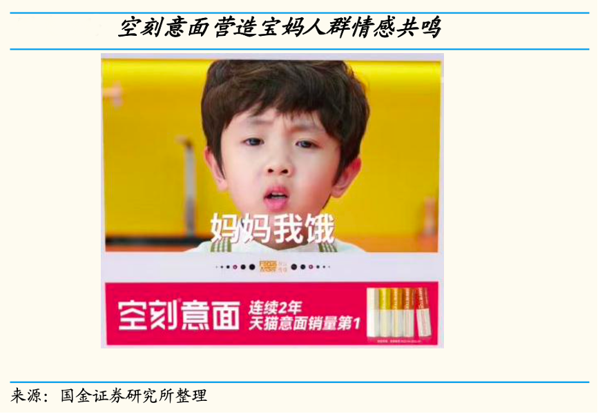 經(jīng)典案例:根據(jù)國金證券研究所等綜合資訊表明,面對(duì)精致寶媽,空刻抓住“愛孩子”、“注重產(chǎn)品健康安全”等特點(diǎn),以電媒“媽媽我餓”等廣告詞,營(yíng)造寶媽情感共鳴。