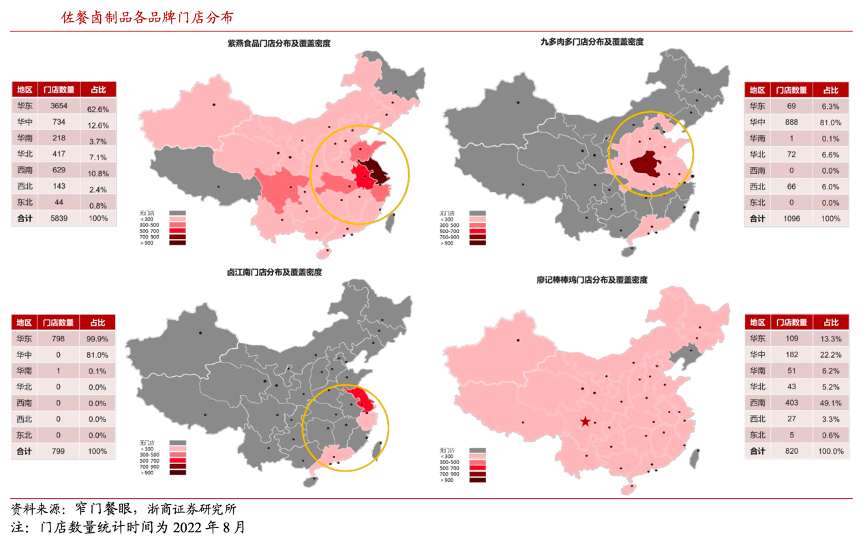 經(jīng)典案例:根據(jù)窄門餐眼、浙商證券研究所等綜合資訊表明,從整體門店數(shù)量來看,紫燕食品門店總數(shù)超過CR2-CR5總和。從區(qū)域分布來看,當(dāng)前紫燕食品在華東的門店數(shù)超3600家、超過CR2-CR5的總和;2022年8月,公司在西南地區(qū)共開設(shè)門店 629 家,約為廖記棒棒雞的 1.5 倍。