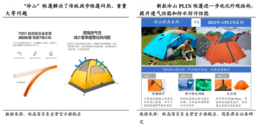 經(jīng)典案例:根據(jù)牧高笛京東自營官方旗艦店、國泰君安證券研究等綜合資訊表明,2003 年,牧高笛公司對帳篷的鋁竿支架和通風系統(tǒng)的創(chuàng)新改進,推出了第一代具有革命性意義的“冷山”徒步帳篷,克服了傳統(tǒng)徒步帳篷悶熱、重量大等痛點,并成為中國徒步露營的標桿產(chǎn)品。目前已推出第五代“冷山”,針對防雨、透氣性能以及產(chǎn)品外觀和配色等方面持續(xù)優(yōu)化,已成為 70 萬用戶的品質之選。