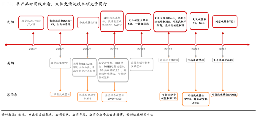 經(jīng)典案例:根據(jù)淘寶、京東官方旗艦店、公司官網(wǎng)、公司年報、公司公眾號及官方微博、西部證券研發(fā)中心等綜合資訊表明,九陽公司免清洗技術(shù)為全球首創(chuàng),且領(lǐng)先于同行。公司 2018 年推出無人破壁豆?jié){機(jī) K61 和 K1,開始布局產(chǎn)品免清洗,2019年發(fā)布了高端免洗豆?jié){機(jī) K 系列、全球第一臺不用手洗的破壁機(jī) Y88,而當(dāng)時競爭品牌卻仍以傳統(tǒng)自清洗和可拆洗路線為主,隨后才陸續(xù)推出免清洗技術(shù)。