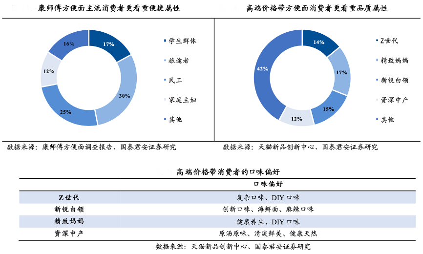 經(jīng)典案例:根據(jù)康師傅方便面調(diào)查報(bào)告、天貓新品創(chuàng)新中心、國泰君安證券研究等綜合資訊表明,隨著消費(fèi)升級趨勢的演進(jìn),在方便面行業(yè)消費(fèi)者的購買傾向逐漸從“方便”屬性轉(zhuǎn)移至“高品質(zhì)”屬性,康師傅方便面主流消費(fèi)者為學(xué)生、旅途者及民工(在康師傅方便面消費(fèi)者中合計(jì)占比達(dá)到7成),這部分人群更看重的是“便捷”屬性,以快速填飽肚子為目的,而高端價(jià)格帶方便面消費(fèi)者以 Z 世代、精致媽媽、新銳白領(lǐng)及資深中產(chǎn)為主,這部分人群更看重產(chǎn)品的品質(zhì)屬性,愿意犧牲一部分便捷屬性。