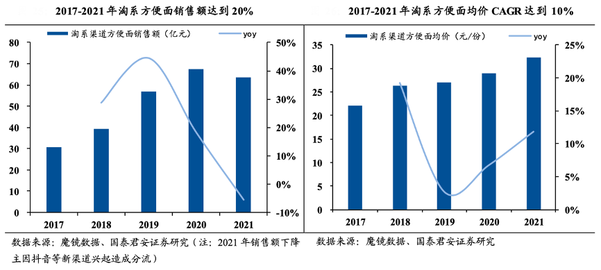 經(jīng)典案例:根據(jù)魔鏡數(shù)據(jù)、國泰君安證券研究等綜合資訊表明,抓住消費(fèi)升級契機(jī)的新品牌自下而上做大了線上高端方便主食行業(yè),并且實(shí)現(xiàn)了更高市場份額的反哺。淘系整體均價(jià)從 2017 年的 22 元/份持續(xù)提升至 2021 年的32 元/份,均價(jià)居于高端價(jià)格帶并且 4 年 CAGR 達(dá)到 10%。