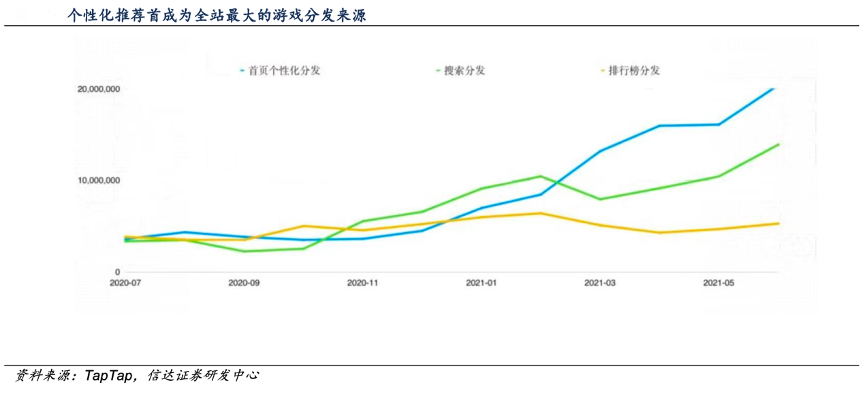 經(jīng)典案例:根據(jù)TapTap、信達證券研發(fā)中心等綜合資訊表明,TapTap在首頁的游戲推薦中全面引入深度學習 的推薦算法,在結(jié)合編輯推薦和社區(qū)評分的基礎上,針對不同用戶的使用習慣及游戲偏好,進行首頁游戲的推薦和排序,即進行個性化推薦。2021年其在推薦算法層面取得較大改善,使得游戲分發(fā)量達到5.79億次,同比增長42.1%。