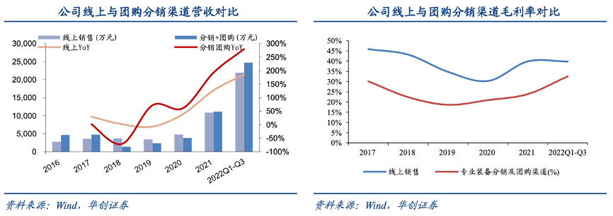 同時(shí),公司非常重視線下渠道,客戶包括零售店、綜合體、同時(shí)擁有 線上線下渠道的成熟客戶(如三夫戶外)、營地進(jìn)行直接采購以及大型商超(如山姆)等, 22Q1-Q3 分銷售團(tuán)購銷售 2.47 億元(YoY+279.56%),毛利率32.53%。