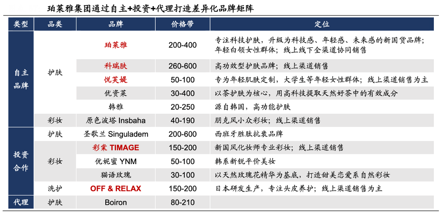 經(jīng)典案例:根據(jù)公司公告、各品牌官網(wǎng)、華福證券研究所等綜合資訊表明,珀萊雅 2009 年起即開(kāi)始進(jìn)行多品牌建設(shè),至今通過(guò)內(nèi)生孵化、外部參股、代理等形式建立起多品牌、多品類的產(chǎn)品矩陣,致力于構(gòu)建新國(guó)貨化妝品產(chǎn)業(yè)平臺(tái)。自主品牌方面,主品牌珀萊雅瞄準(zhǔn)年輕白領(lǐng)女性群體主打大眾化科技護(hù)膚,悅芙媞專為大學(xué)生等年輕女性群體的年輕肌膚定制,科瑞膚聚焦高功效護(hù)膚領(lǐng)域;投資合作方面,彩棠聯(lián)合專業(yè)化妝師唐毅打造新國(guó)風(fēng)彩妝品牌,OFF & RELAX 源于日本研發(fā),專注頭皮養(yǎng)護(hù)。