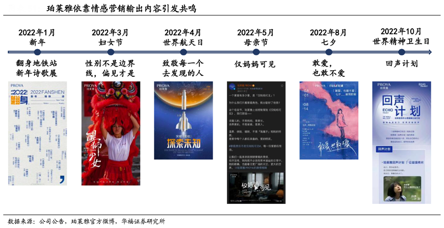 經(jīng)典案例:根據(jù)公司公告、珀萊雅官方微博、華福證券研究所等綜合資訊表明,2021年起,珀萊雅在簽約代言人營(yíng)銷之外加碼情感營(yíng)銷,持續(xù)不斷地輸出優(yōu)質(zhì)內(nèi)容,敏銳洞察社會(huì)熱點(diǎn)。2021 年 3 月在國(guó)際婦女節(jié)之際,珀萊雅聯(lián)合《中 國(guó)婦女報(bào)》共同發(fā)起“性別不是邊界線,偏見(jiàn)才是”話題,聯(lián)動(dòng) KOL 積極發(fā)聲,微博 TVC 播放量近400 萬(wàn)次;2022 年 3 月延續(xù)此話題,邀請(qǐng)醒獅全女班以及女足運(yùn)動(dòng)員推出《醒獅少女》主題片,微博視頻播放量再度接近 400 萬(wàn)次,引起廣泛共鳴。10 月在世界精神衛(wèi)生日再次推出回聲計(jì)劃,聚焦青年心理健康,增強(qiáng)與核心受眾的 情感連接,進(jìn)一步強(qiáng)化品牌價(jià)值。