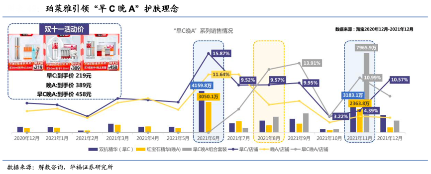 經(jīng)典案例:根據(jù)解數(shù)咨詢、華福證券研究所等綜合資訊表明,珀萊雅公司結合成功傳播的“早 C 晚 A”概念,2021 年 6 月推出雙抗精華+紅寶石精華套裝,相對于獨立單品,采取低件單價、高客單價的產(chǎn)品策略,前期種草鋪設和持續(xù)進行消費者教育,2021 年雙 11 期間實現(xiàn)“早 C 晚 A”套裝的爆發(fā),2021 年 11 月在淘系平臺以 7965.9 萬元的銷售額超越兩大單品 GMV 之和,淘系平臺的銷售占比達到 10.99%。
