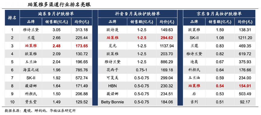 經(jīng)典案例:根據(jù)魔鏡、蟬媽媽、華福證券研究所等綜合資訊表明,以2022年9月數(shù)據(jù)為例,珀萊雅在淘系/抖音/京東渠道化妝品排名中分列國貨品牌第 1/第 2/第 1,全行業(yè)第 3/第 2/第 8,銷售額分別達到 2.48 億元/1-2.5 億元/0.54 億元。其中淘系平臺 9 月銷售額超越傳統(tǒng)強勢國際品牌歐萊雅、玉蘭油。