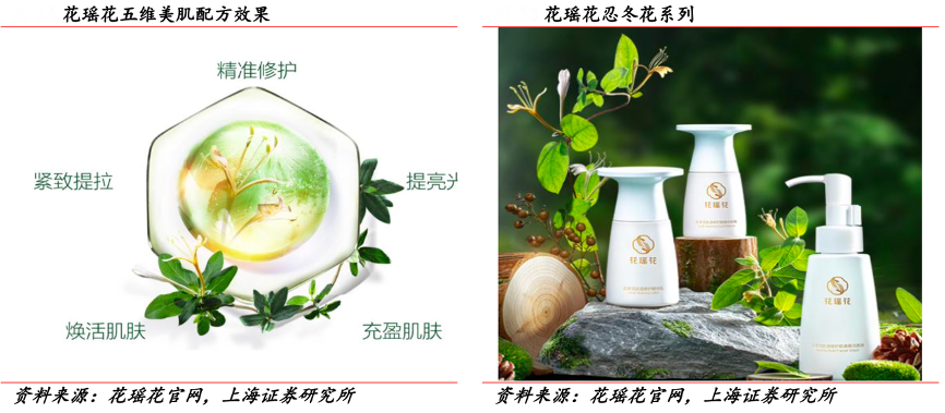 經(jīng)典案例:根據(jù)花瑤花官網(wǎng)、上海證券研究所等綜合資訊表明,花瑤花來源于少數(shù)民族花瑤村落,開創(chuàng)了以花養(yǎng)顏理念,基于核心原料忍冬花,復配 10 種天然花粹,誕生了 Flomiracle 五維美肌配方,從彈、潤、亮、緊致、細膩五個維度精準修復,強韌肌底,通過以花養(yǎng)顏來傳遞品牌健康美肌的理念。
