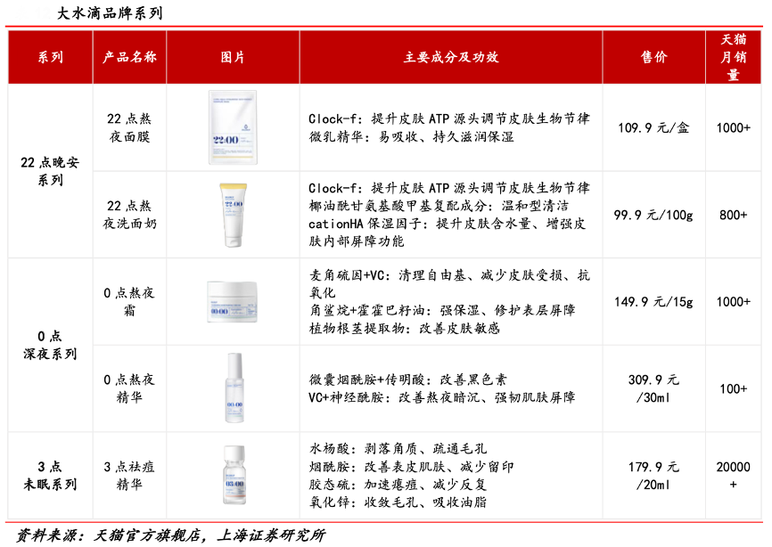 經(jīng)典案例:根據(jù)天貓官方旗艦店、上海證券研究所等綜合資訊表明,結(jié)合肌膚生物節(jié)律,大水滴產(chǎn)品分為三大時間系列,同時2022H1其聚焦 3 點祛痘精華打造大單品,斬獲天貓、抖音、快 手等多渠道祛痘精華銷量 top1, 全網(wǎng)銷售超百萬瓶,品牌 GMV 破億。