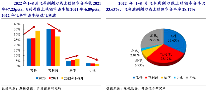 經(jīng)典案例:根據(jù)魔鏡數(shù)據(jù)、開源證券研究所等綜合資訊表明,2022年 1~8 月飛科剃須刀線上銷額市占率為33.63%,較2021年全年+7.23pcts; 飛利浦線上銷額市占率為 28.17%,較 2021 年全年-6.89pcts。飛科剃須刀的外觀設計較飛利浦更具年輕、時尚的特點,在智能化體驗上超過同價位飛利浦,較飛利浦更具性價比。