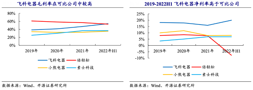 經(jīng)典案例:根據(jù)wind、開源證券研究所等綜合資訊表明,2021年飛科電器營收增長 12.13%的情況下,在原材料價格的綜合負面因素影響下飛科電器營業(yè)成本僅上升 1.21%。同業(yè)比較來看,2019~2022 年 H1 飛科電器銷售毛利率在可比公司中較高且保持穩(wěn)定增長。其供應鏈穩(wěn)定且上游議價能力較強,2022年 H1 凈利率較 2021 年提升4.04pcts。