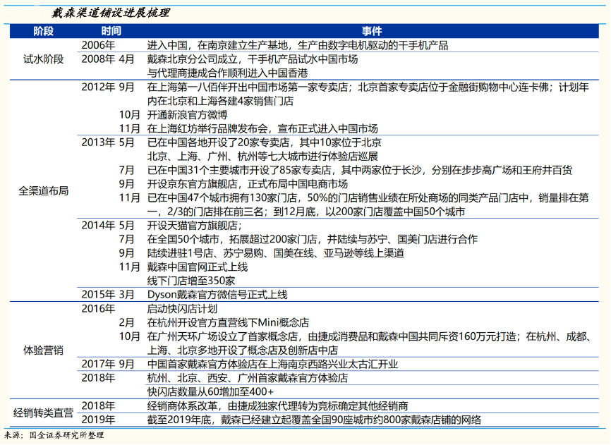 經(jīng)典案例:根據(jù)市場公開資料、國金證券研究所等綜合資訊表明,戴森中國線上:線下渠道收入比例約為1:1,其渠道鋪設(shè)進展,并將其劃分為 4 個階段:試水階段、全渠道布局、轉(zhuǎn)型體驗營銷、經(jīng)銷商改革。伴隨門店數(shù)量持續(xù)擴張,截至 2019 年底,戴森已經(jīng)建立起覆蓋全國90座城市約 800 家戴森店鋪的網(wǎng)絡(luò)。
