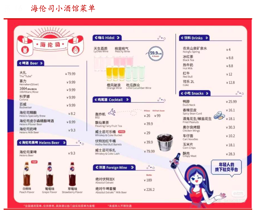 經(jīng)典案例:根據(jù)華西證券研究所等綜合資訊表明,海倫司酒水小食定制化,SKU 打造極致性價比。海倫司小酒館菜單包含四類產(chǎn)品:酒飲、軟飲料、小食與其他產(chǎn)品。(1)單瓶啤酒均不超過 10 元,客單價處于較低水平,具有極致的性價比。根據(jù)艾媒咨詢,2021 年我國小酒館消費(fèi)者消費(fèi)因素調(diào)查的數(shù)據(jù)顯示,約 48.8%的消費(fèi)者看重價格,進(jìn)一步驗(yàn)證海倫司對年輕客群的吸引力。