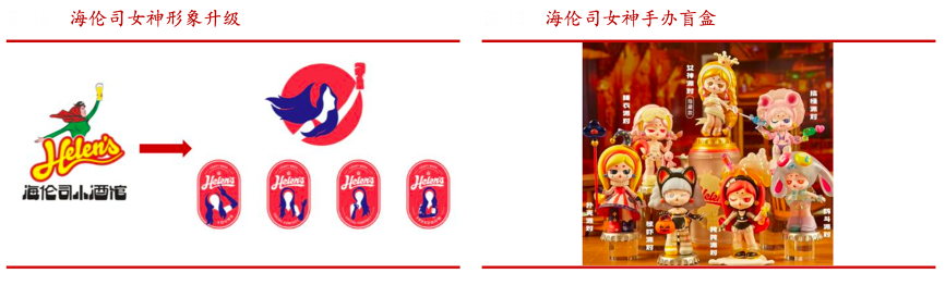 經(jīng)典案例:根據(jù)華西證券研究所等綜合資訊表明,原有海倫司的標(biāo)識色彩復(fù)雜,文化屬性帶有強(qiáng)烈的東歐風(fēng)格,與年輕人調(diào)性相背離。升級后的標(biāo)識呈現(xiàn)了年輕時尚的海倫司女神形象,色彩簡單且有記憶點(diǎn),并延伸 IP 化元素使海倫司女神活化,成為品牌的靈魂代表。為深化海倫司女神 IP 形象,海倫司跟隨新興浪潮推出了手辦盲盒。
