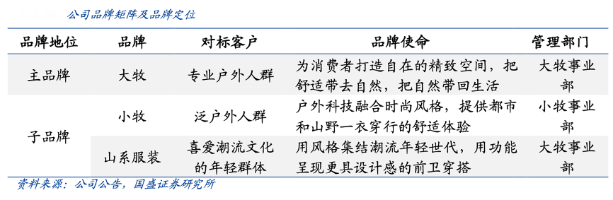 經(jīng)典案例:根據(jù)公司公告、國盛證券研究所等綜合資訊表明,2021年,牧高笛公司對(duì)品牌理念進(jìn)行進(jìn)一步升級(jí),形成了以“大牧”(Mobi Garden)為主品牌,“小牧”(Mobi Garden Urban)與“山系服裝”(MOBI VILLA)為子品牌的品牌矩,并明確品牌風(fēng)格和對(duì)標(biāo)客戶,即“大牧”品牌主要提供戶外專業(yè)裝備及服裝,“小牧”品牌主要提供多場景穿著。