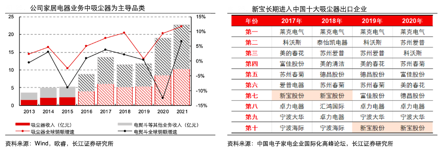 經(jīng)典案例:根據(jù)wind、歐睿、中國電子家電企業(yè)國際化高峰論壇、長江證券研究所等綜合資訊表明,新寶公司經(jīng)營中,吸塵器在公司家居電器業(yè)務(wù)中占主導(dǎo)地位,2013-2015年,吸塵器在家居電器業(yè)務(wù)中的占比穩(wěn)定在45%,電熨斗等其他品類占比穩(wěn)定在55%;考慮到家居電器主要以外銷為主,且近年來吸塵器海外增速持續(xù)優(yōu)于電熨斗表現(xiàn),預(yù)計吸塵器業(yè)務(wù)占比仍在穩(wěn)步提升,2017-2020 年間公司連續(xù)進入中國十大吸塵器出口企業(yè)榜單。