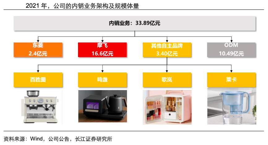 經(jīng)典案例:根據(jù)wind、公司公告、長江證券研究所等綜合資訊表明,新寶內(nèi)銷已形成多品牌經(jīng)營矩陣,子品牌共用新寶研發(fā)、生產(chǎn)平臺,營銷層面各自推廣。其中,關(guān)注度最高且表現(xiàn)最為亮眼的當(dāng)屬“摩飛”,成就了 2017 年確立代 理至 2021 年收入達到 16.6 億的成長奇跡;其次,東菱作為早期成立的子品牌,經(jīng)多年 發(fā)展,2021 年收入規(guī)模達到 2.4 億。