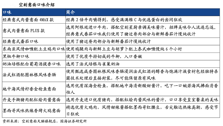 經(jīng)典案例:根據(jù)空刻意面天貓旗艦店、國海證券研究所等綜合資訊表明,空刻意面的目標(biāo)人群為寶媽及25歲以上的白領(lǐng),消費(fèi)場景定位為家庭消費(fèi),目前已經(jīng)開發(fā)出多種口味供消費(fèi)者選擇,更有多重品質(zhì)背書。