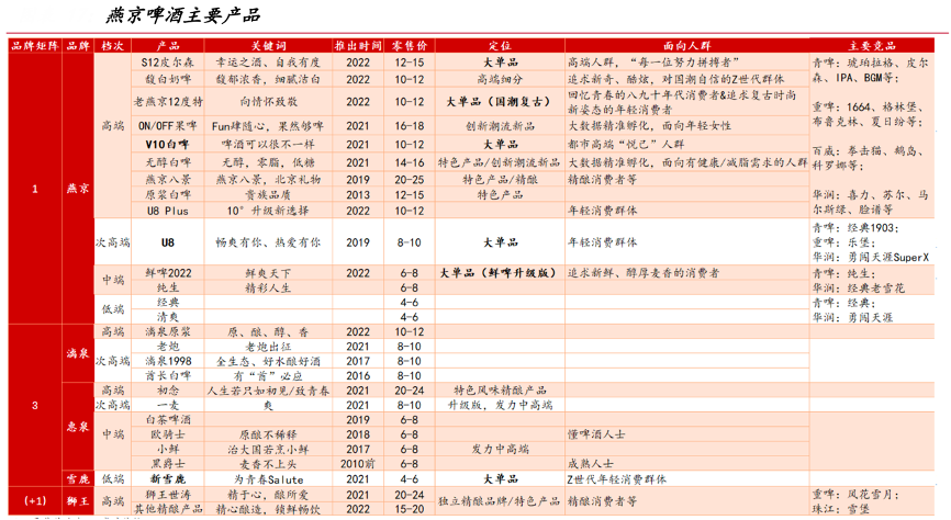 經(jīng)典案例:根據(jù)公司公告、國聯(lián)證券研究所等綜合資訊表明,近兩年在大單品 U8 成功的帶領下,燕京加速 10 元以上高端產(chǎn)品的推新,以面向不同人群的多元化產(chǎn)品在競爭中搶占細分市場,比如特色產(chǎn)品無醇白啤面向有健康、減脂需求人群,ON/OFF果啤面向年輕女性,獅王獨立品牌布局精釀市場等。