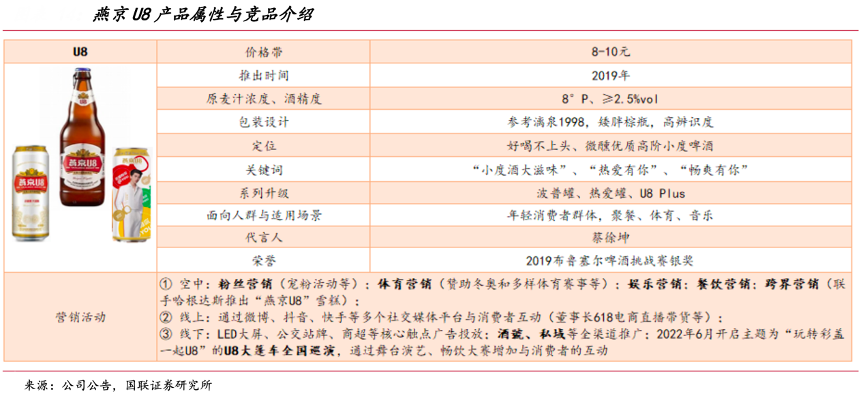 U8 推出后市場反響好,不斷升級系列產(chǎn)品迎合消費者需求,陸續(xù)推出 U8 系列波普罐、熱愛罐等 定制化產(chǎn)品,并針對廣東、新疆等地消費者對較濃口感的需求于今年推出“10度升級新選擇”U8 Plus,拓寬了 U8 家族的產(chǎn)品系列。